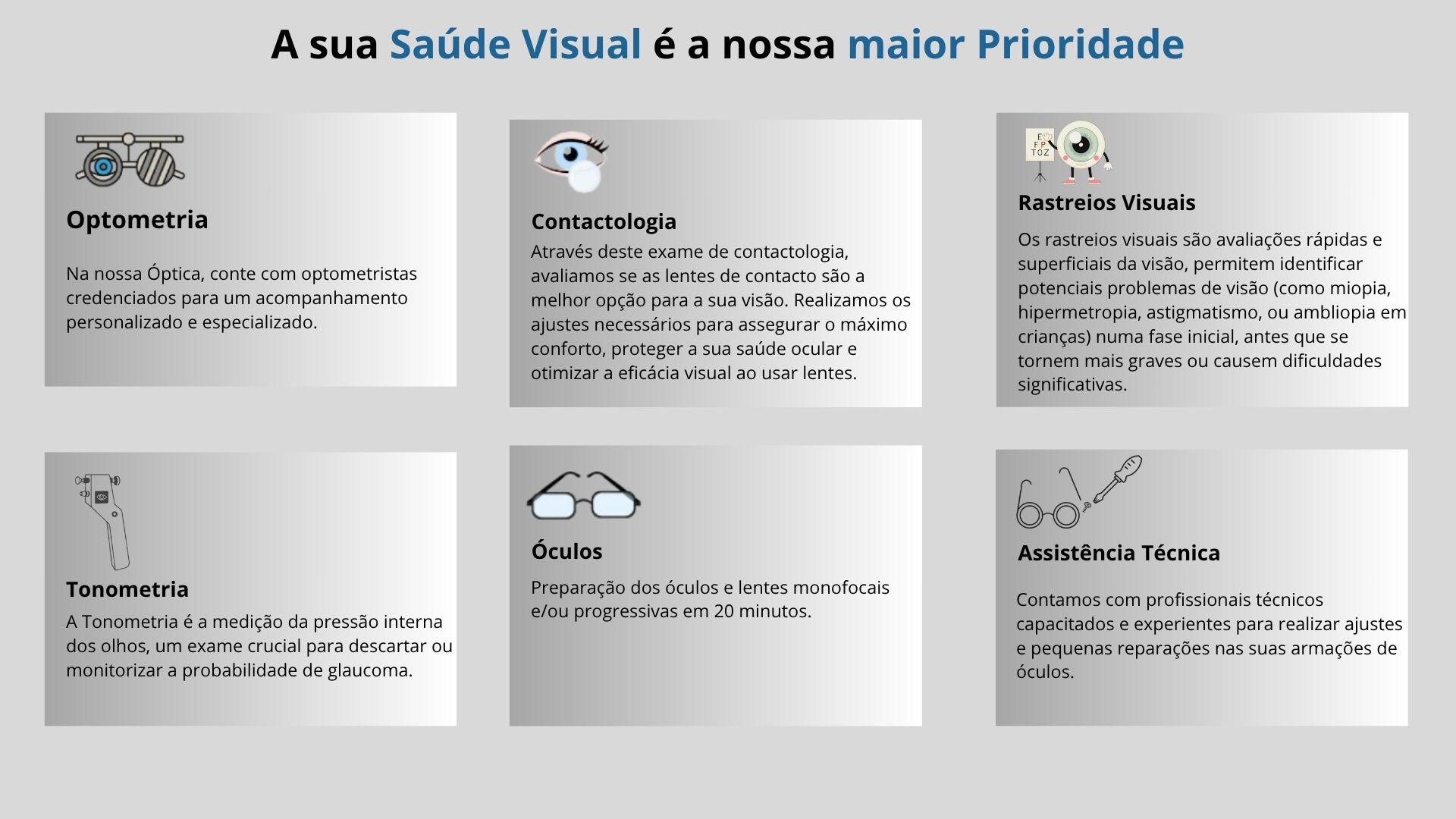 Na nossa ótica, oferecemos mais do que apenas produtos; apresentamos soluções visuais completas que se adaptam perfeitamente ao seu estilo de vida e necessidades.